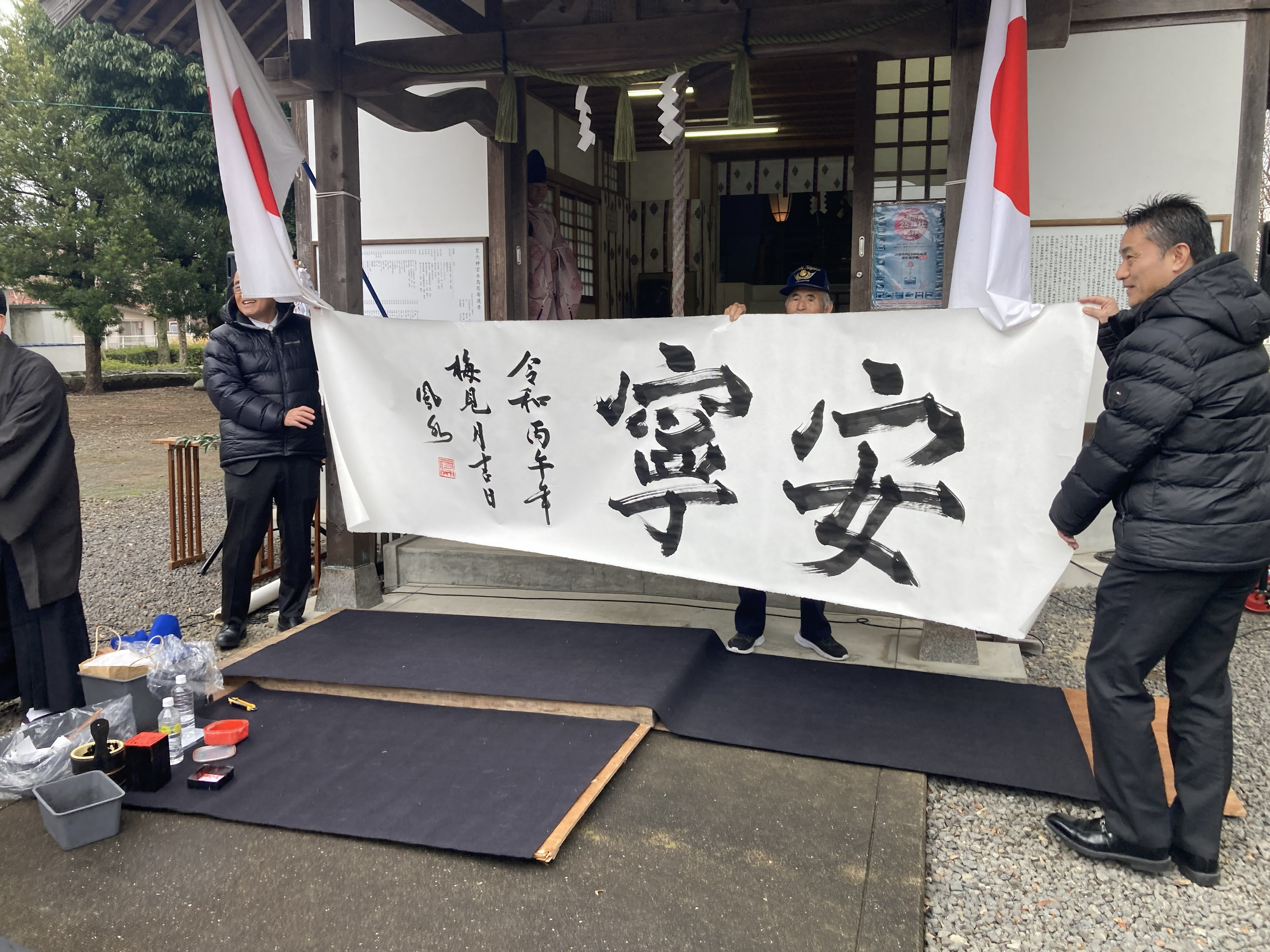 建国を記念し書道家堂々と衆目の中「安寧」と書く